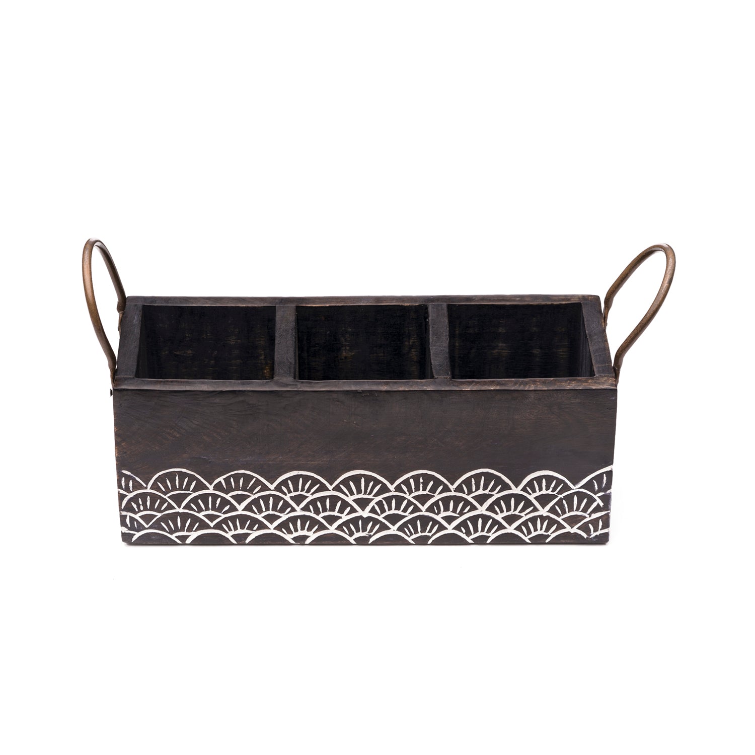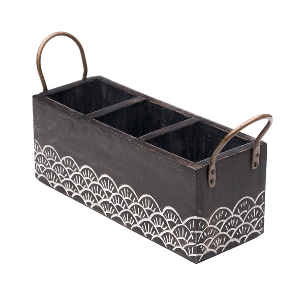 Wooden flatware caddy expertly crafted from sustainable mango wood with lively hand-carved scallop design in white rub finish. Complete with metal, measures 10.75 inches by 4 inches by 4 inches.